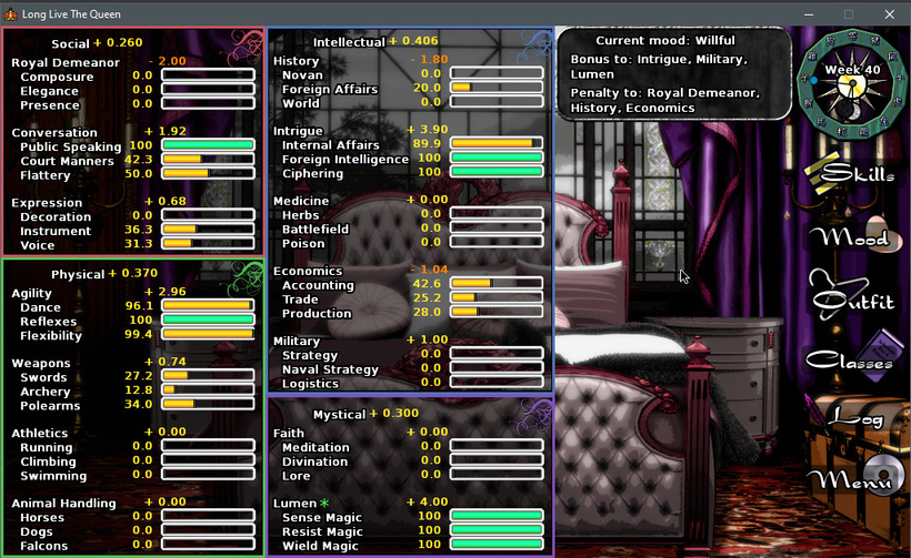 Long Live the Queen utilizes beautiful brevity and very short scenes to enable the monstrous amount of skill checks presented to the player. It's almost like a puzzle, to discern what skill checks come up at various times.