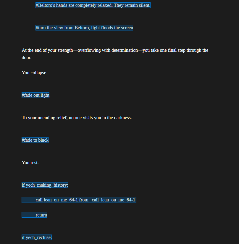 When I need a break from writing and editing, I'll be making that betting pool for the length of the game's script in our community Discord!The Word Count Betting Event (which needs a cooler name) is running until the final word count is tallied! I have the event open in our Community Discord at least through the end of November—by my best estimates, running the regex will take a solid five hours or more to do one chapter at a time, thanks to the size of the WIP script!- Next month's devlog will cover the remaining character writing subjects I wanted to cover (second person perspective and unreliable narration). I'll also be sharing progress on all of this November writing!! πͺπ₯π₯π₯