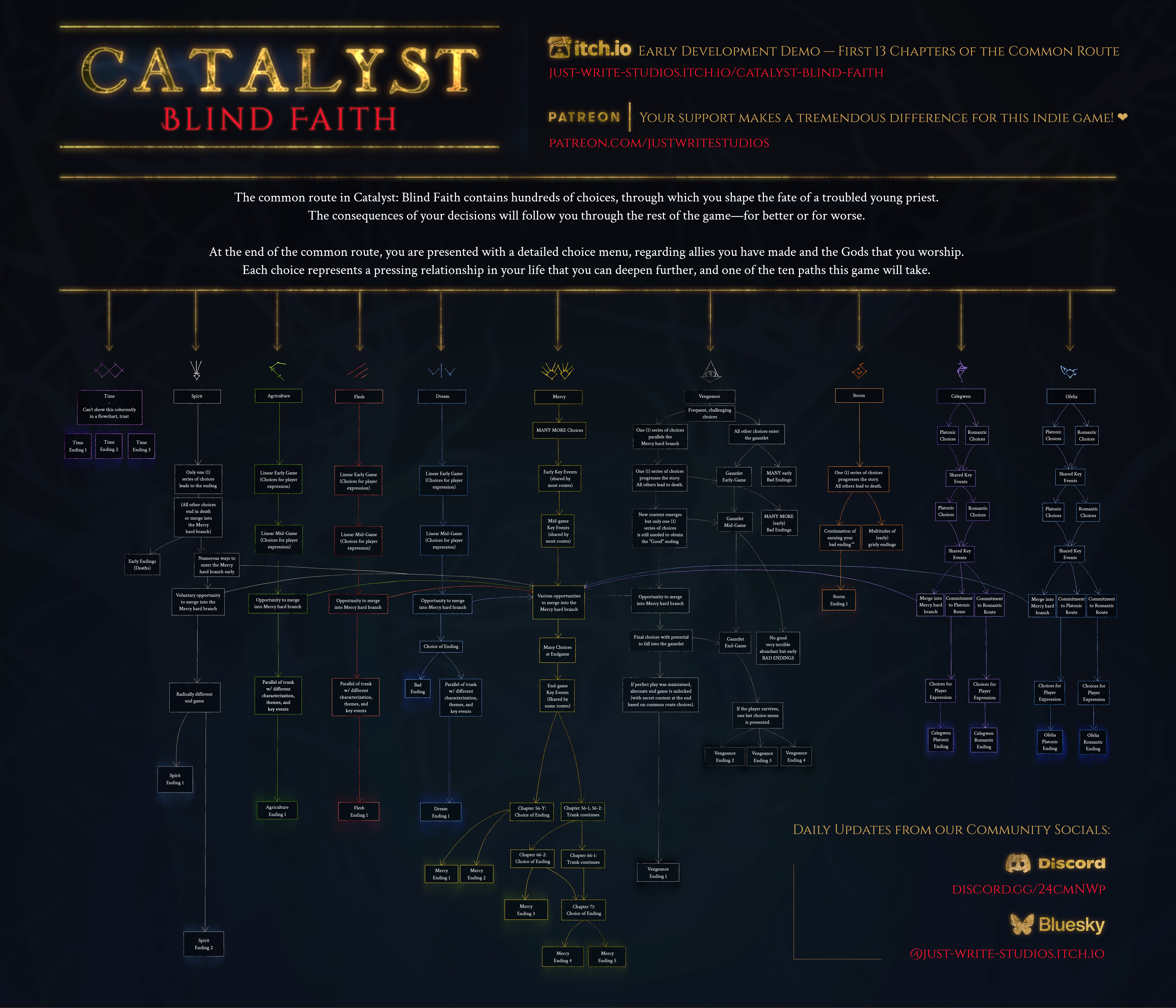 This verrrry large image is best viewed at high res! I've scrunched and compressed it down to fit on itch.io's teeny tiny filesize limit. This image, and all other images in this devlog, are also attached to the crosspost of this devlog on my Patreon (for free!) at high res for your viewing and downloading enjoyment. This shows a hyper-simplified version of the choice structure for the full game of Catalyst: Blind Faith.